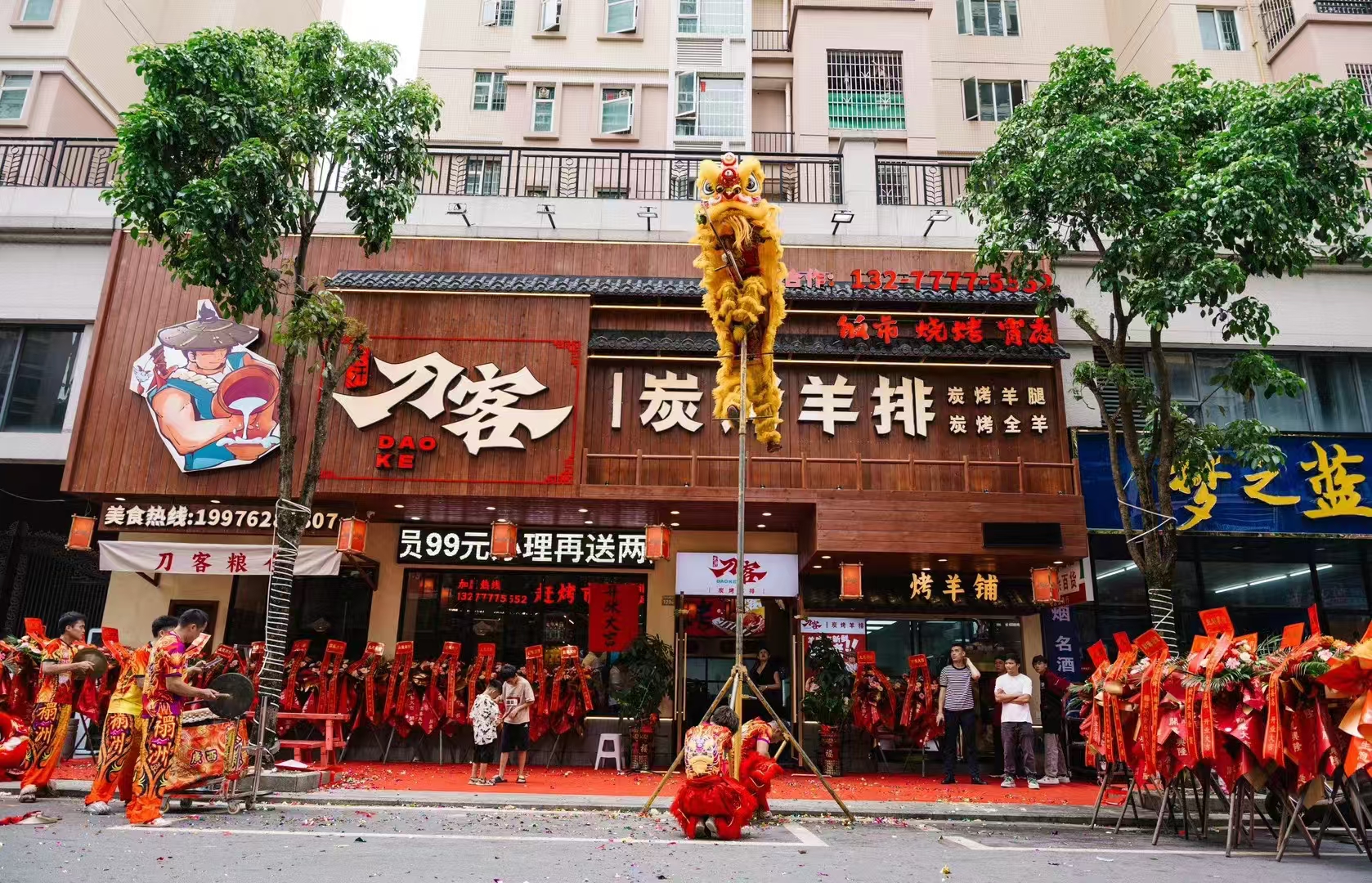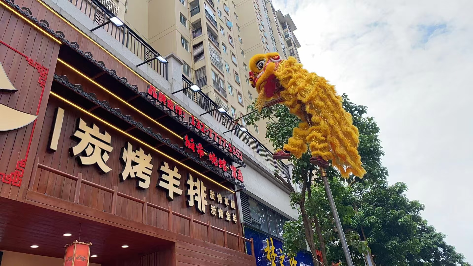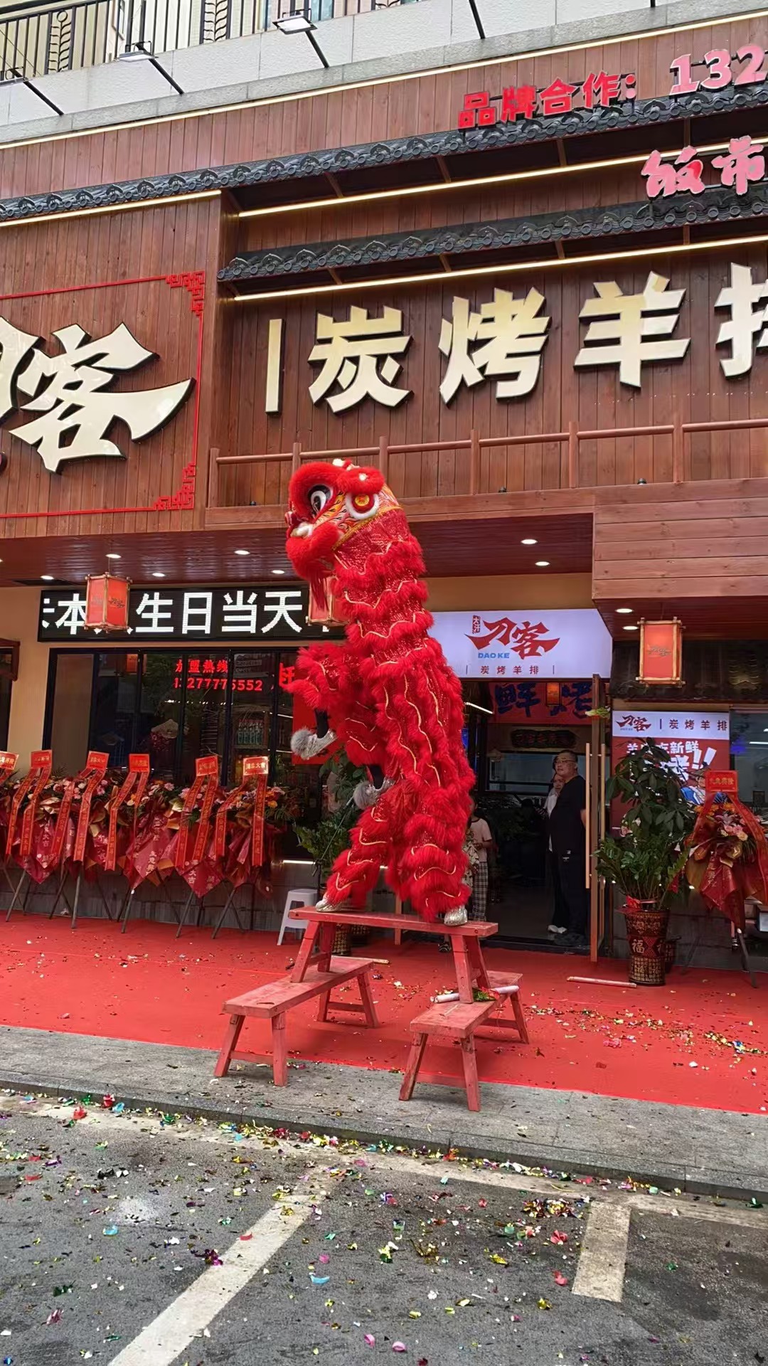 狮子吐瑞广西梧州市藤县藤州镇河东锦绣豪庭西街藤县碳烤羊排店开业,藤县舞狮队藤县禤洲龙狮团藤县狮队舞狮表演开业庆,双狮献瑞,狮子跳凳,狮子高杆表演 -