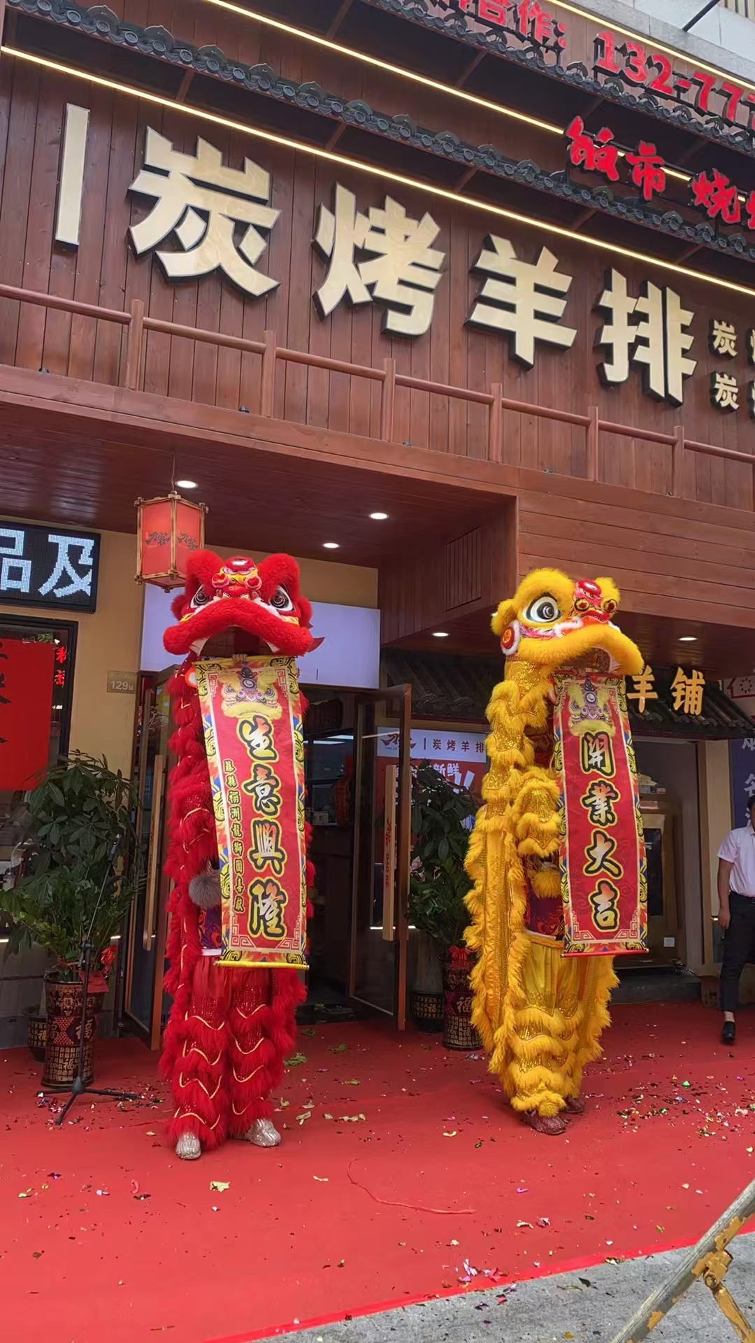 狮子双狮表演2024年8月23日,上午广西梧州市藤县藤州镇河东锦绣豪庭西街藤县碳烤羊排店开业,藤县舞狮队藤县禤洲龙狮团藤县狮队舞狮表演开业庆,双狮献瑞,狮子跳凳,狮子高杆表演 -