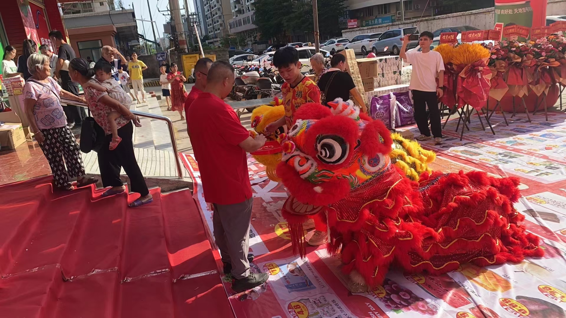 藤县醒狮队藤县禤洲龙狮团舞狮狮子点睛,7月14日,梧州龙圩龙城购物广场生活超市开业!