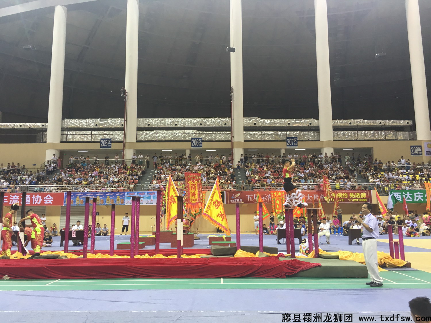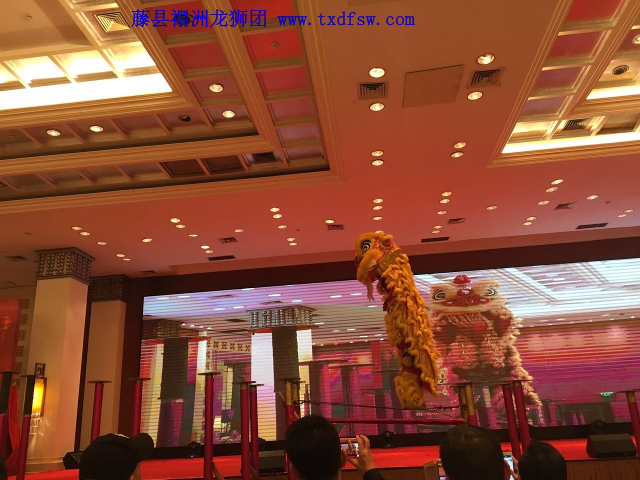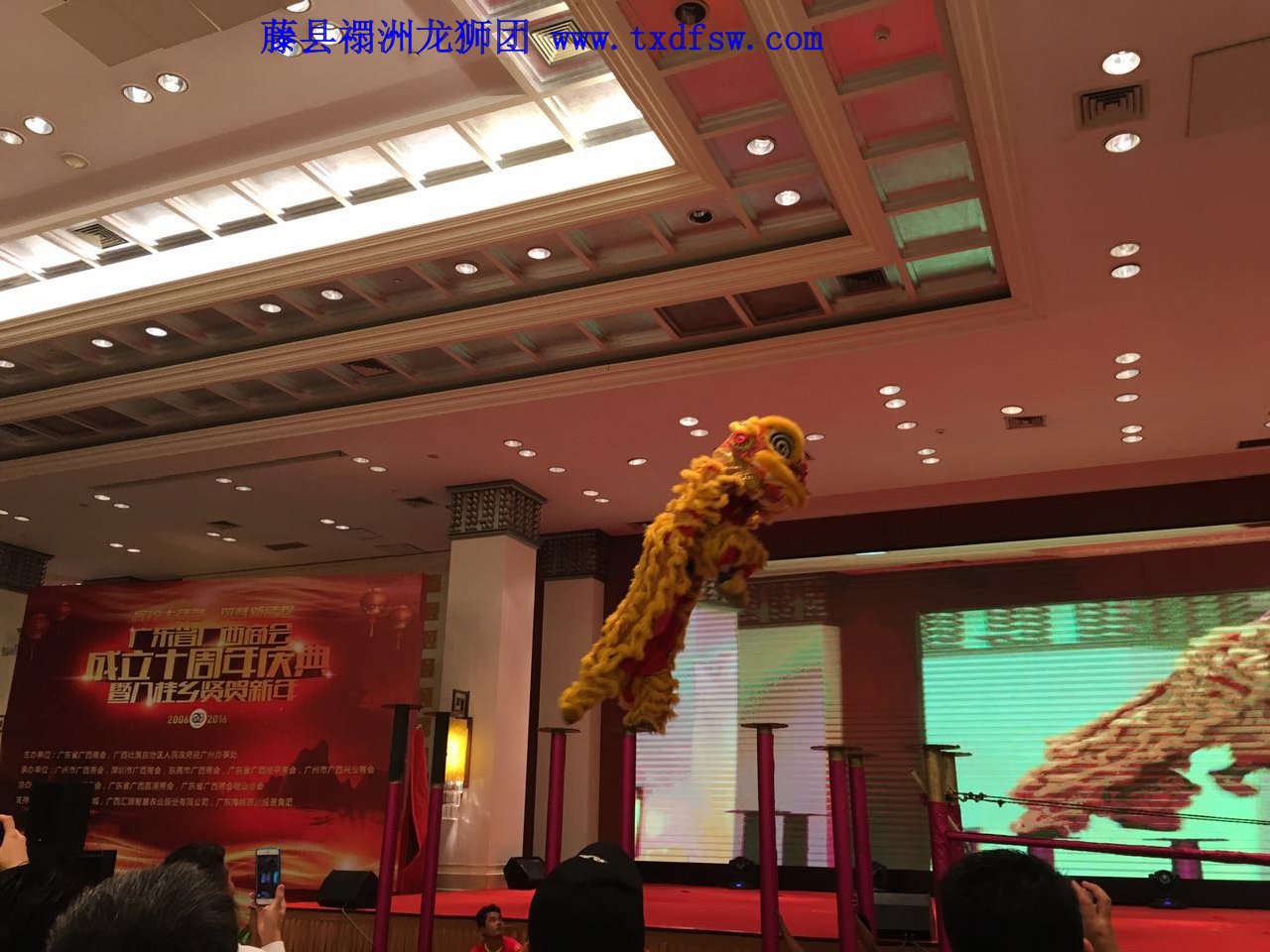 舞狮飞桩2016年12月20号,在广州东方宾馆,广东省广西商会成立十周年庆典舞狮表演,运动舞狮飞桩跳跃表演。 -
