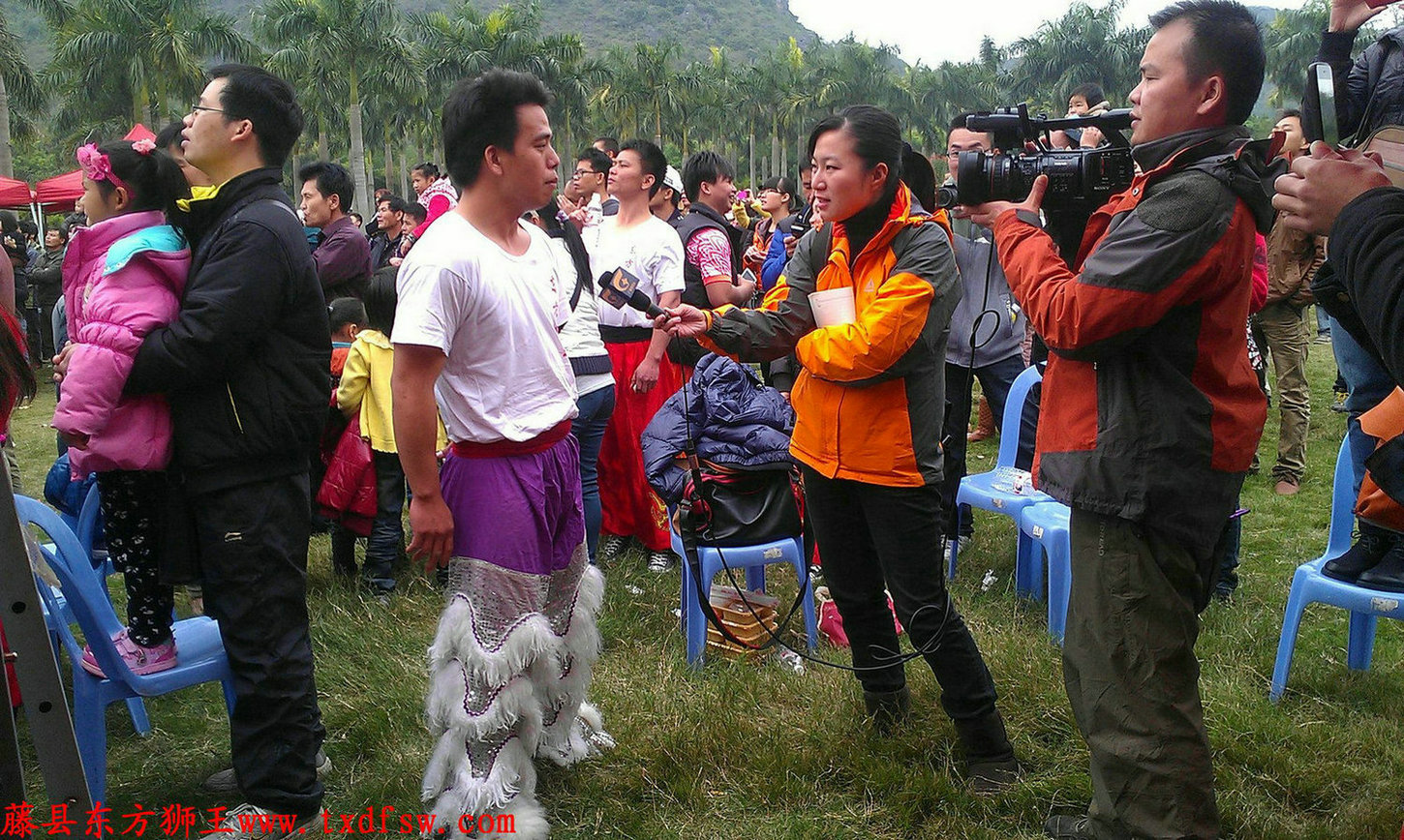 广西电视台采访2013年广西南宁首届花花在世界狮王争霸,藤县禤洲醒狮团冠军队广西电视台采访舞狮运动员。 -