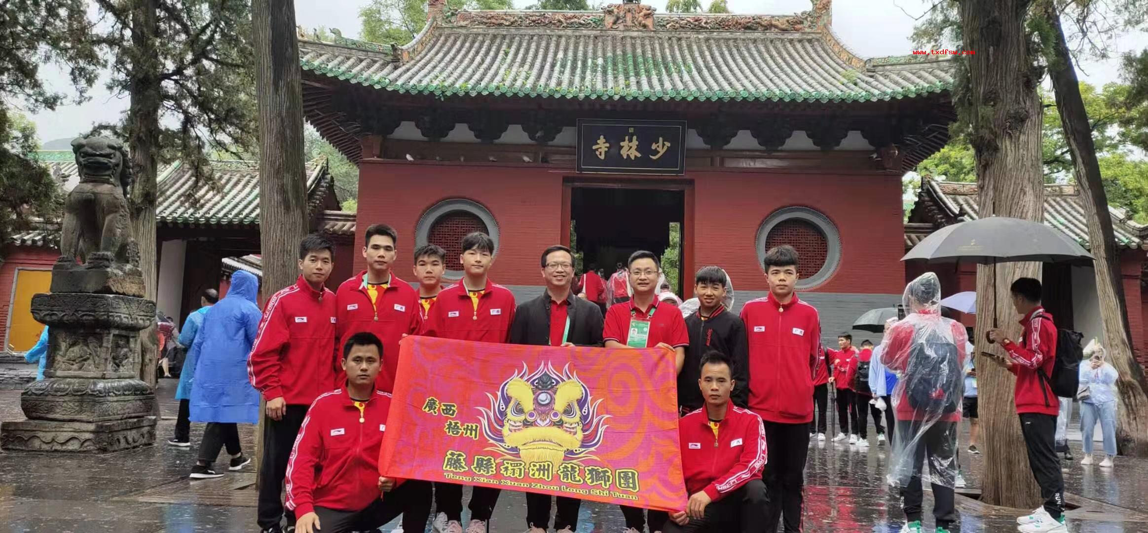 少林寺一游2019年9月11日,广西梧州藤县禤洲龙狮团代表广西参加全国少数民族传统体育运动会表演项目技艺类比赛的一行12人到河南少林寺一游,集体合照。