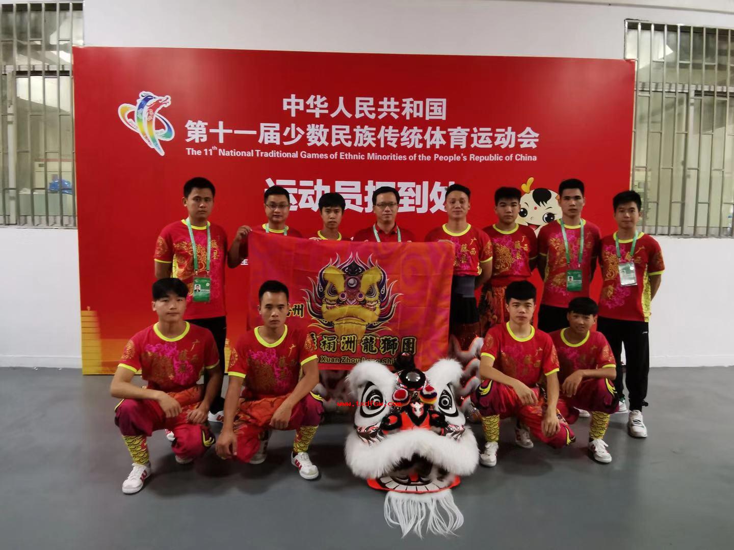 运动员签到2019年9月10日,广西梧州藤县禤洲龙狮团代表广西参加全国少数民族传统体育运动会表演项目技艺类比赛第一轮赛穿到,集体合照。 -
