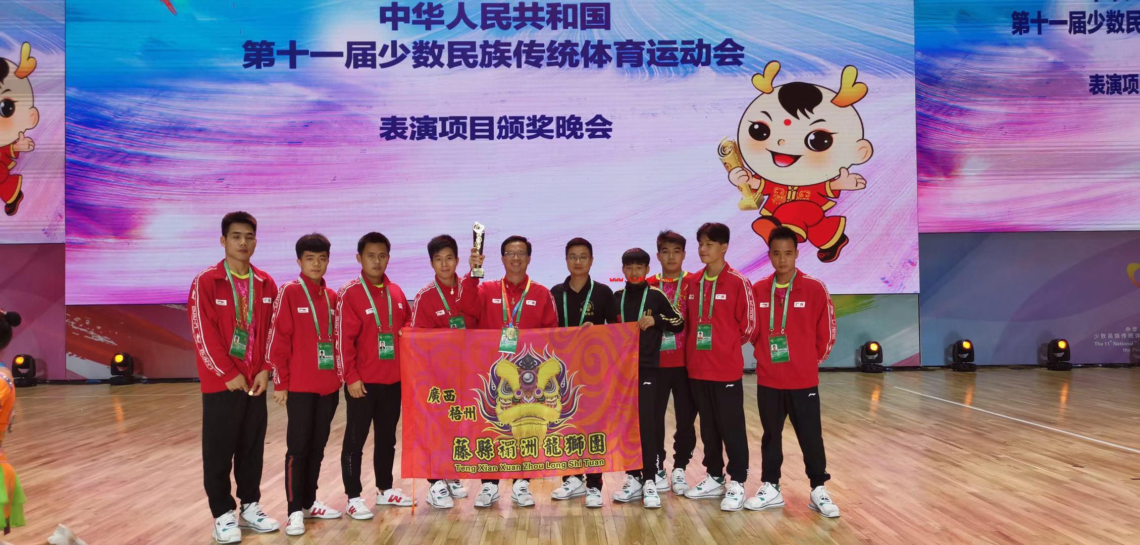 表演项目颁奖2019年9月10日,以广西梧州藤县禤洲龙狮团为代表广西参加全国少数民族传统体育运动会表演项目技艺类比赛一等奖,集体合照。 -