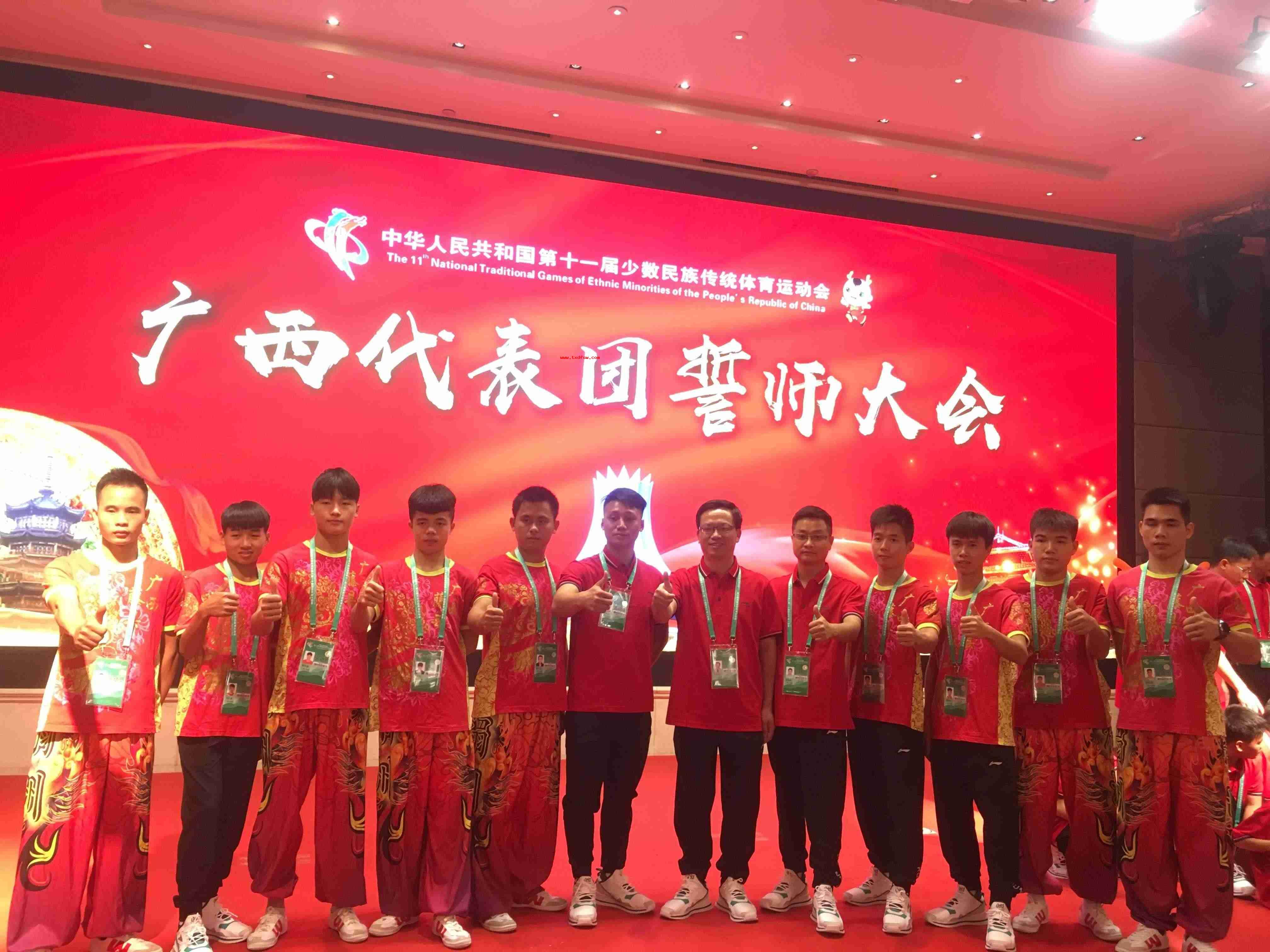郑州比赛誓师大会合照2019年9月8日至16日,第十一届全国少数民族传统体育运动会在河南郑举行,梧州藤县禤洲龙狮团有幸代表广西参加第十一届全国少数民族传统体育运动会表演项目技艺类比赛,以高桩舞狮参赛。广西代表团高桩舞狮比赛誓师大会合照 -