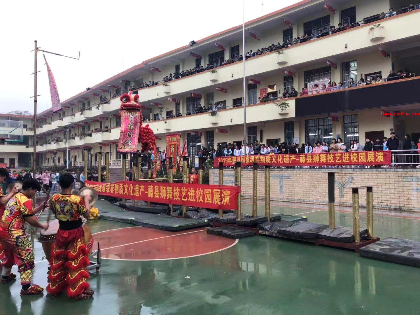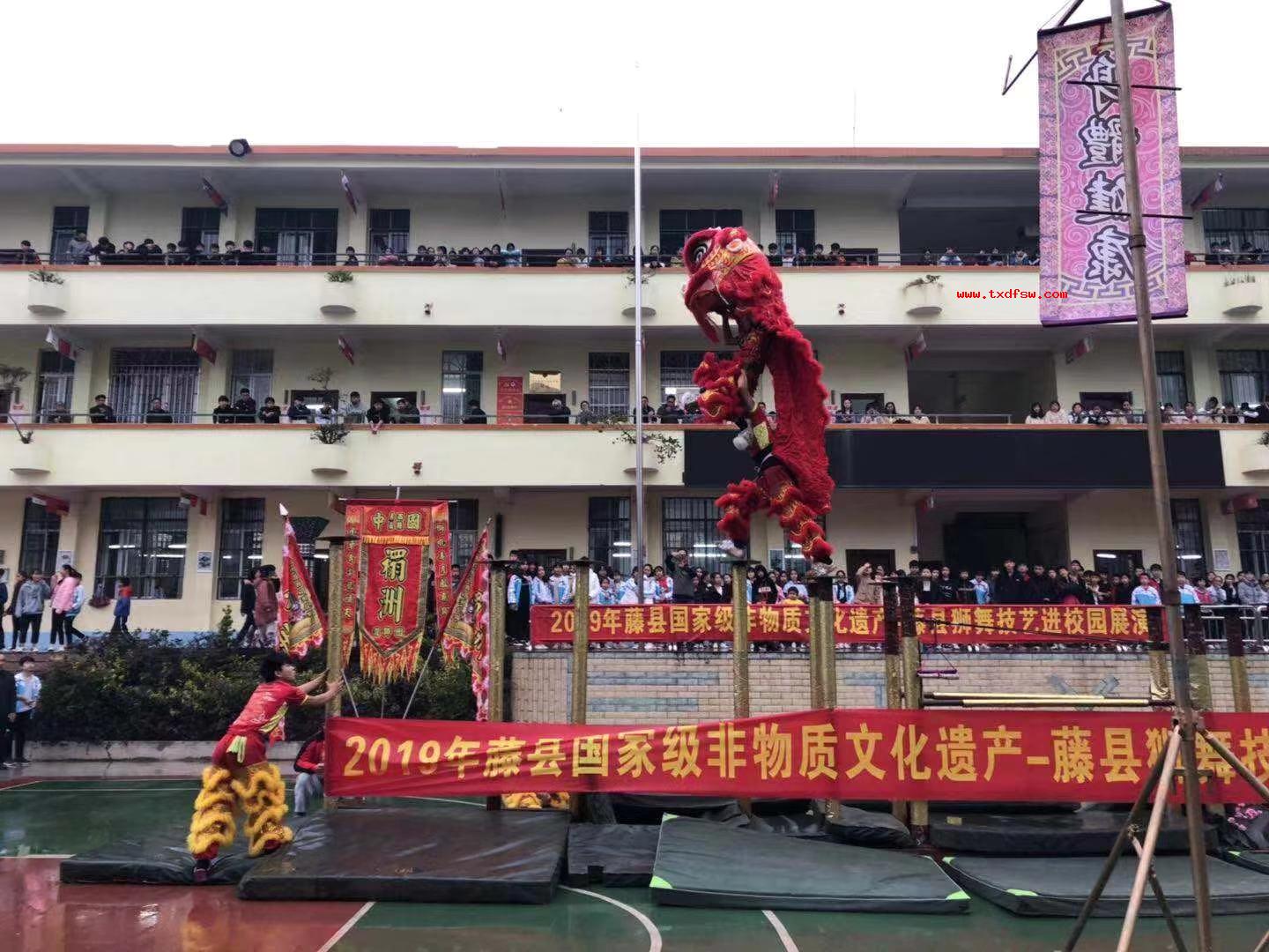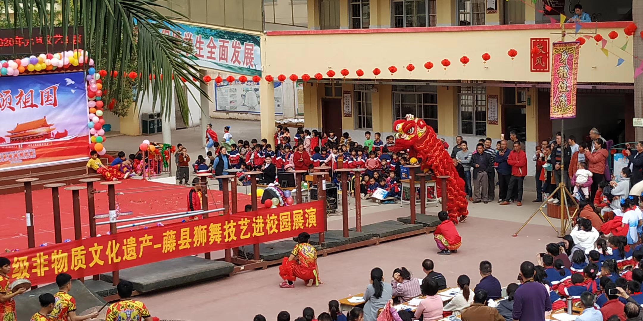 高桩舞狮2019国家级非物质文化遗产_藤县狮舞技艺进校园展演 -