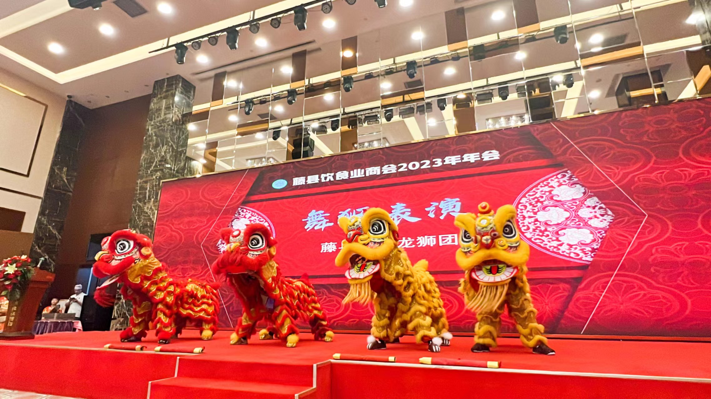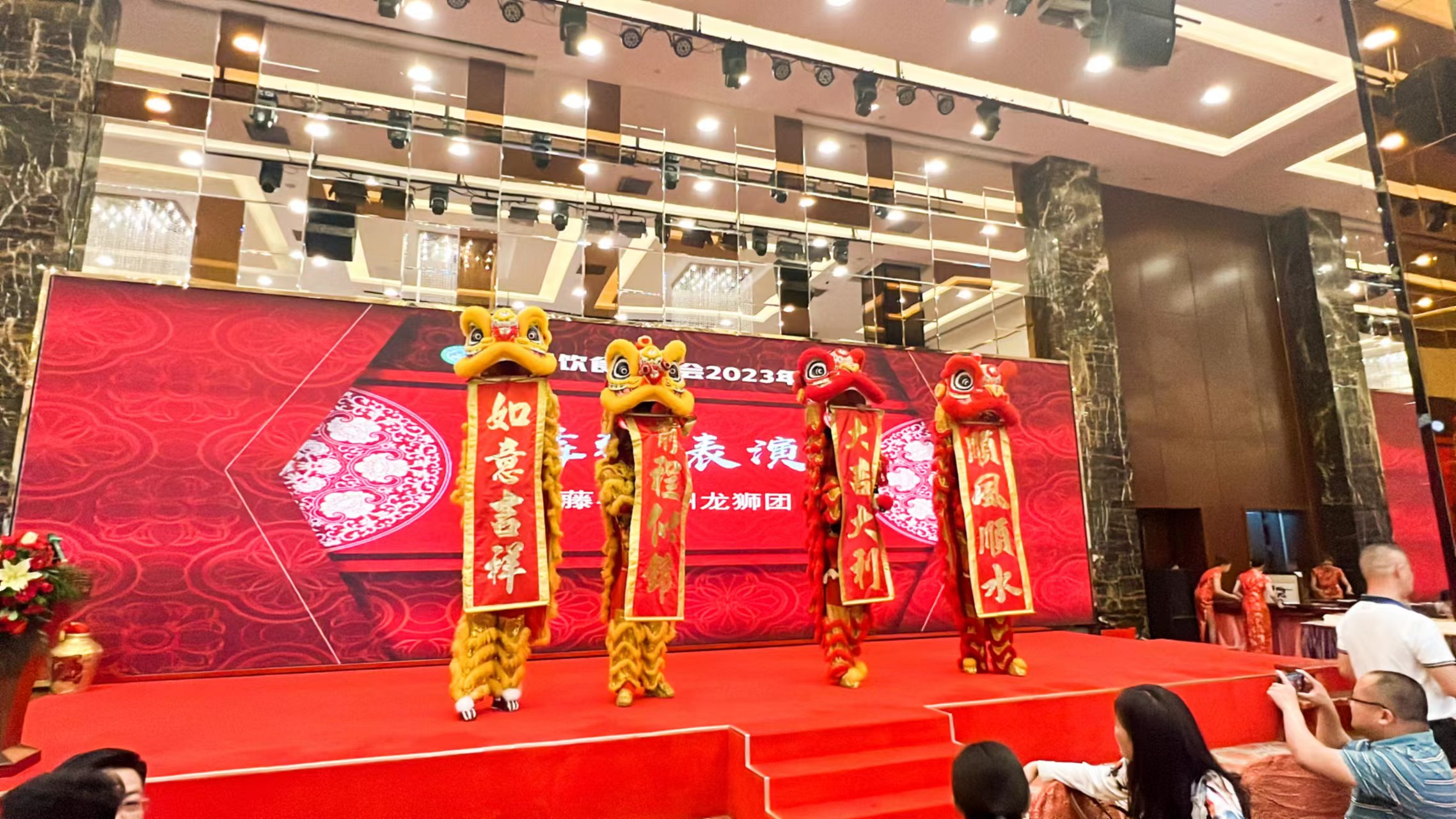 群狮表演7月7日晚,广西梧州市藤县保盈大酒店二楼海悦厅,藤县餐饮行业协会举办2023年年会庆 -
