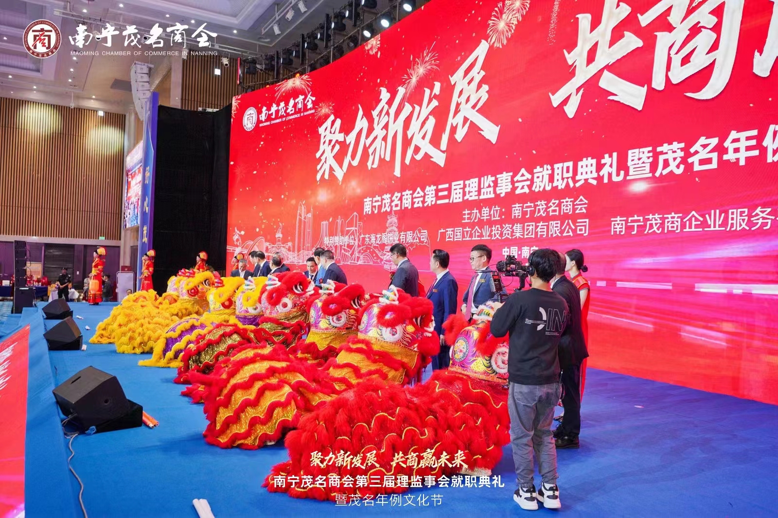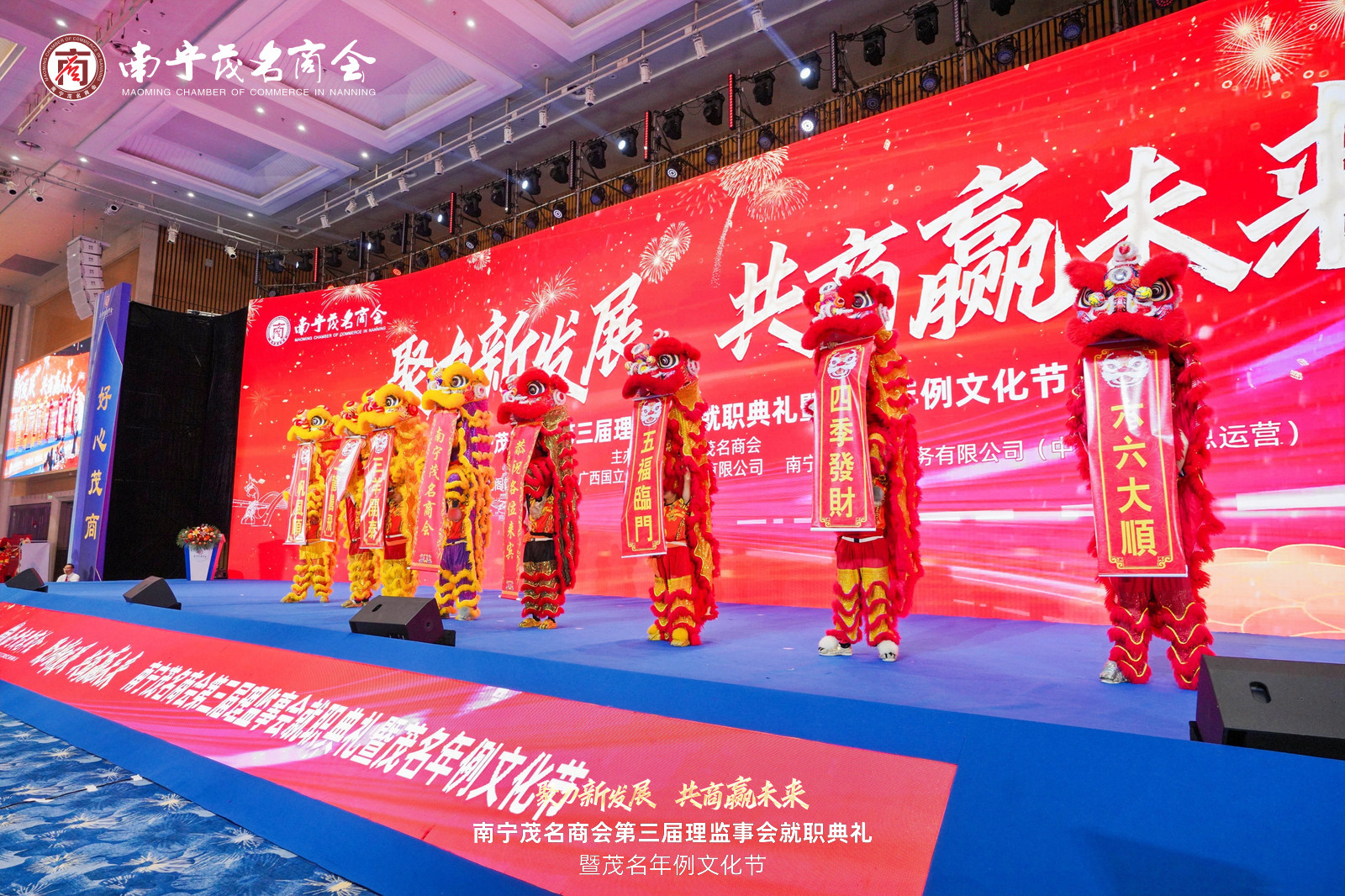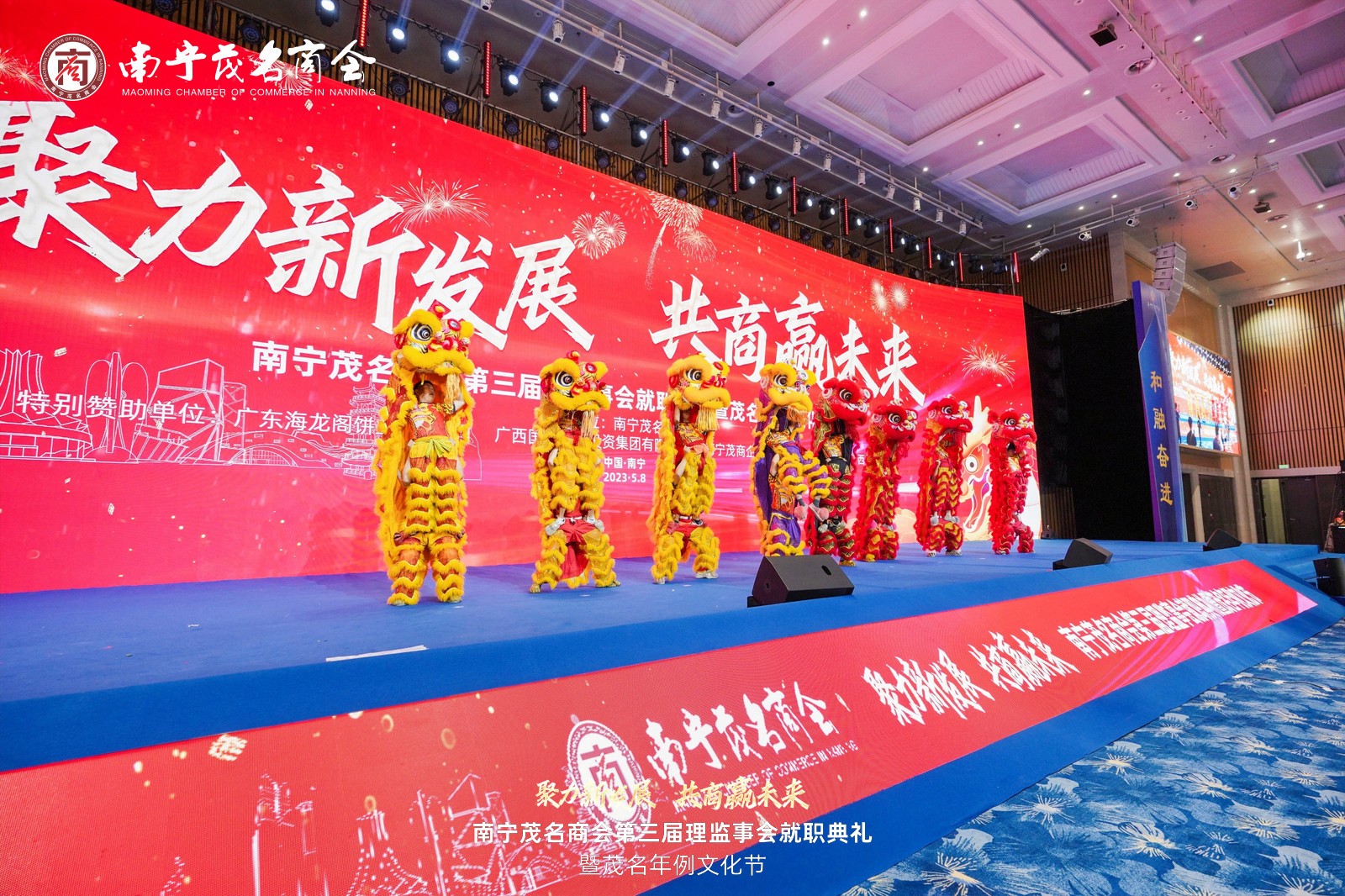 醒狮合照5月8日傍晚,南宁茂名商会第三届理监事会就职典礼暨茂名年例文化节在南宁国际会展中心金桂花厅隆重举行。舞狮表演狮子点 -