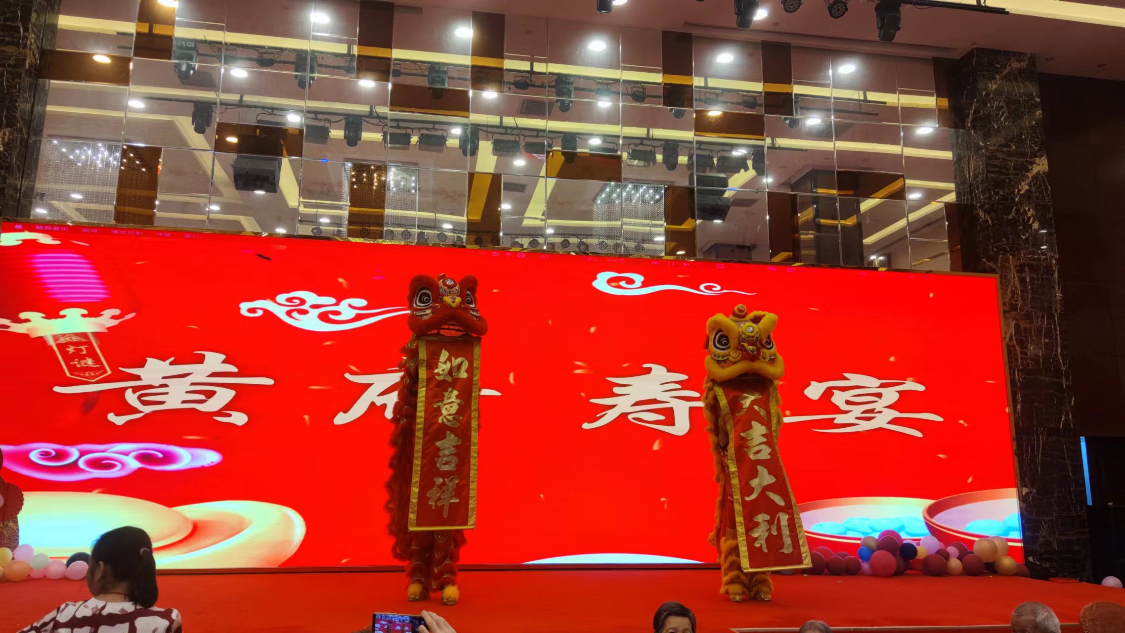 生日宴舞狮双狮献瑞6月7日晚,在藤县保盈酒店二楼海悦大厅,藤县黄府寿宴藤县醒狮队藤县禤洲龙狮团舞狮表演,表演节目有双狮献瑞、醉狮、狮子跳凳、高桩舞狮等节 -