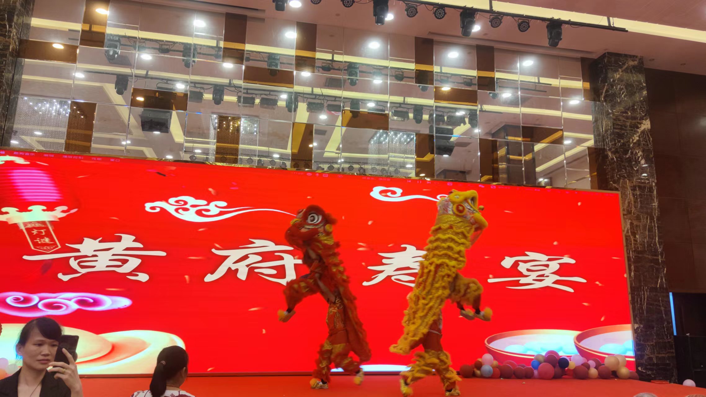 双狮表演6月7日晚,在藤县保盈酒店二楼海悦大厅,藤县黄府寿宴藤县醒狮队藤县禤洲龙狮团舞狮表演,表演节目有双狮献瑞、醉狮、狮子跳凳、高桩舞狮等节 -