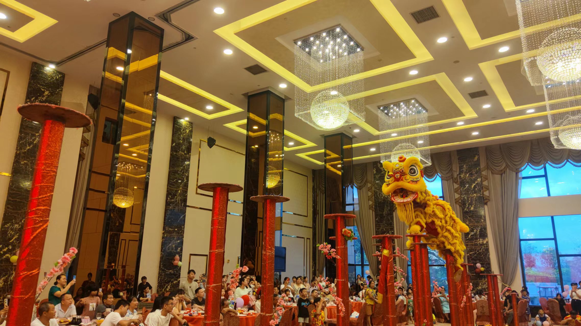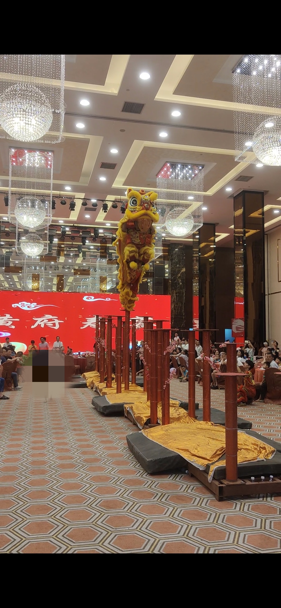 梅花桩舞狮6月7日晚,在藤县保盈酒店二楼海悦大厅,藤县黄府寿宴藤县醒狮队藤县禤洲龙狮团舞狮表演,表演节目有双狮献瑞、醉狮、狮子跳凳、高桩舞狮等节 -