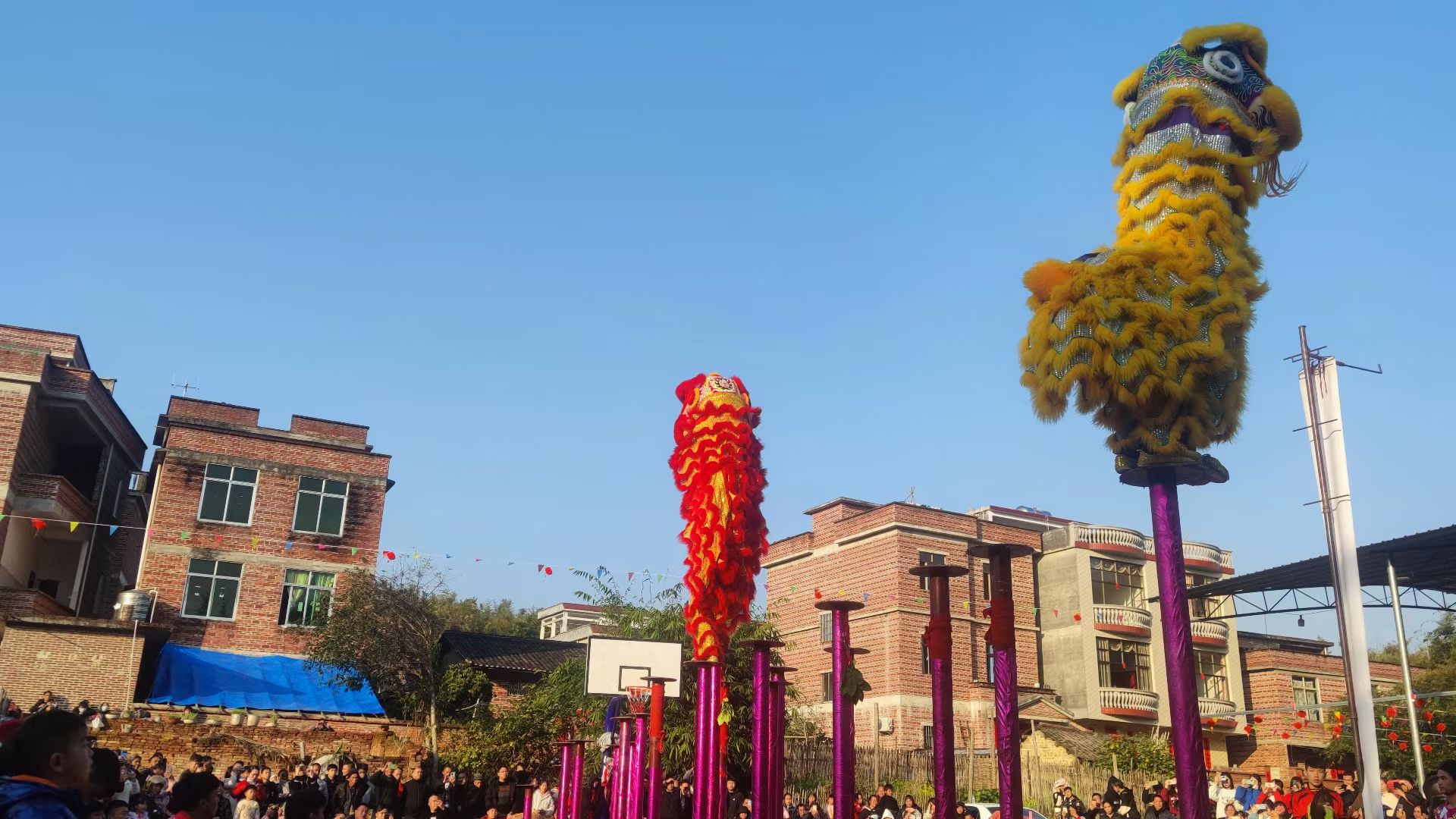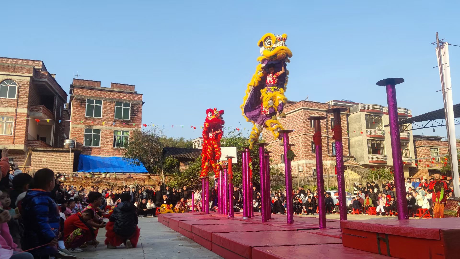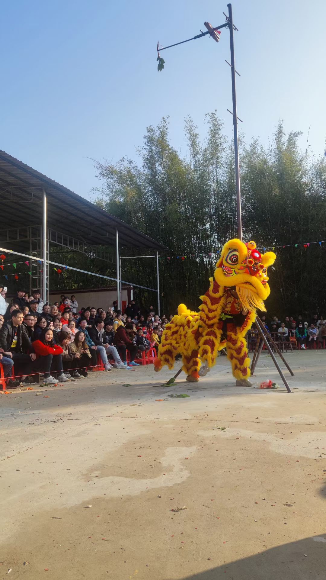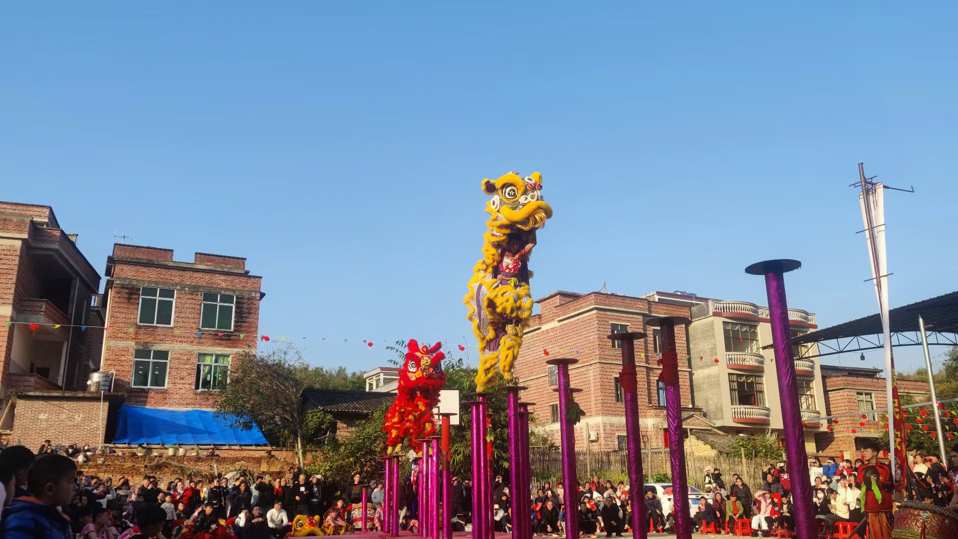 狮子爬高杆2022年1月4日,初四立春广西梧州梨阜大塘村春节舞狮表 -